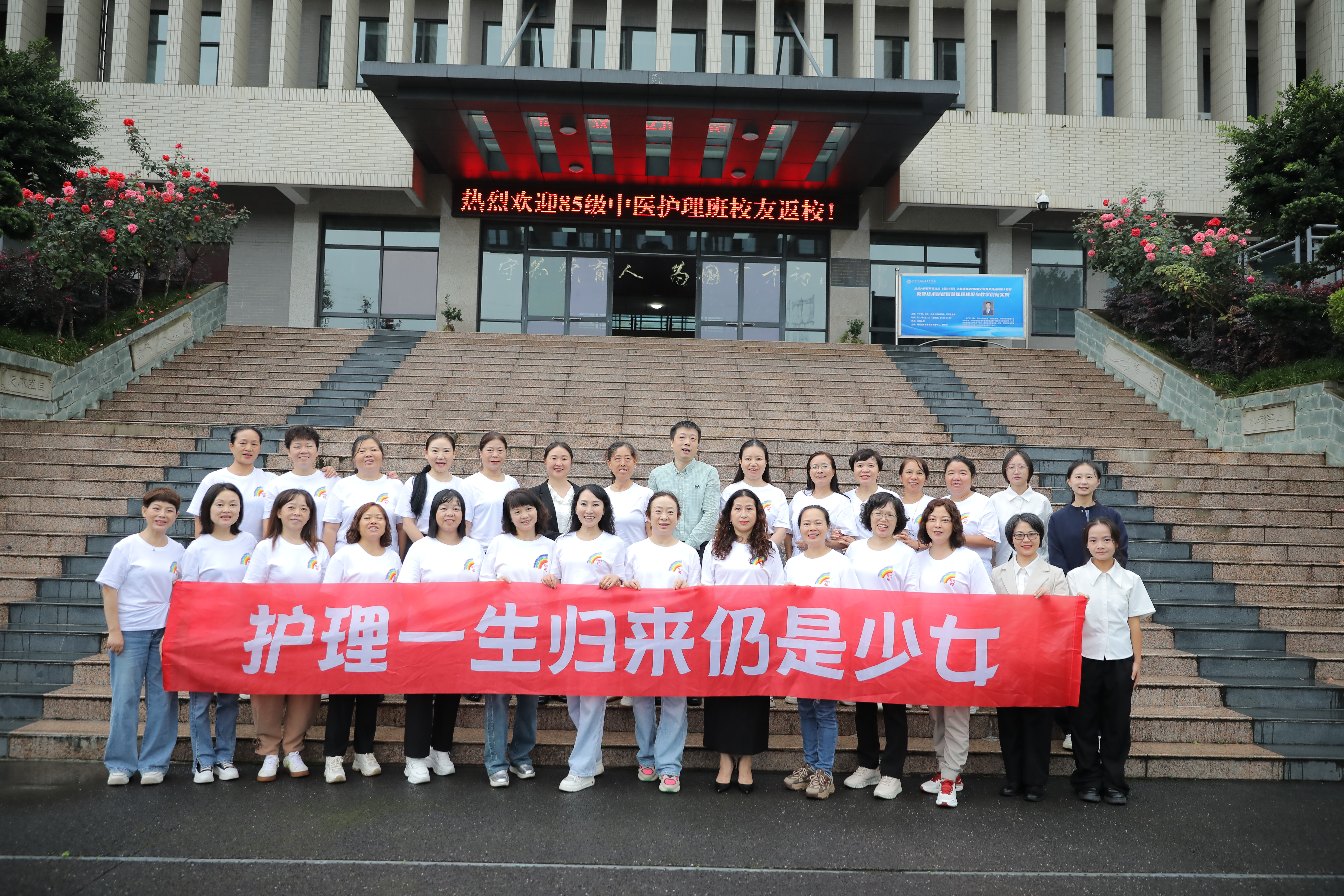 9月21日,原绵阳中医学校85级中医护理班校友重返母校,共庆入学40周年。校友们怀着对母校的深厚情谊,与在校师生一起开展了“卌载回眸·校史溯源”“重返十八岁·母校校园行”“聚首一堂·共话情谊”“寻味·母校记忆”等系列活动,一同追忆青春岁月,感受母校发展变迁,传承勤学不辍的精神。