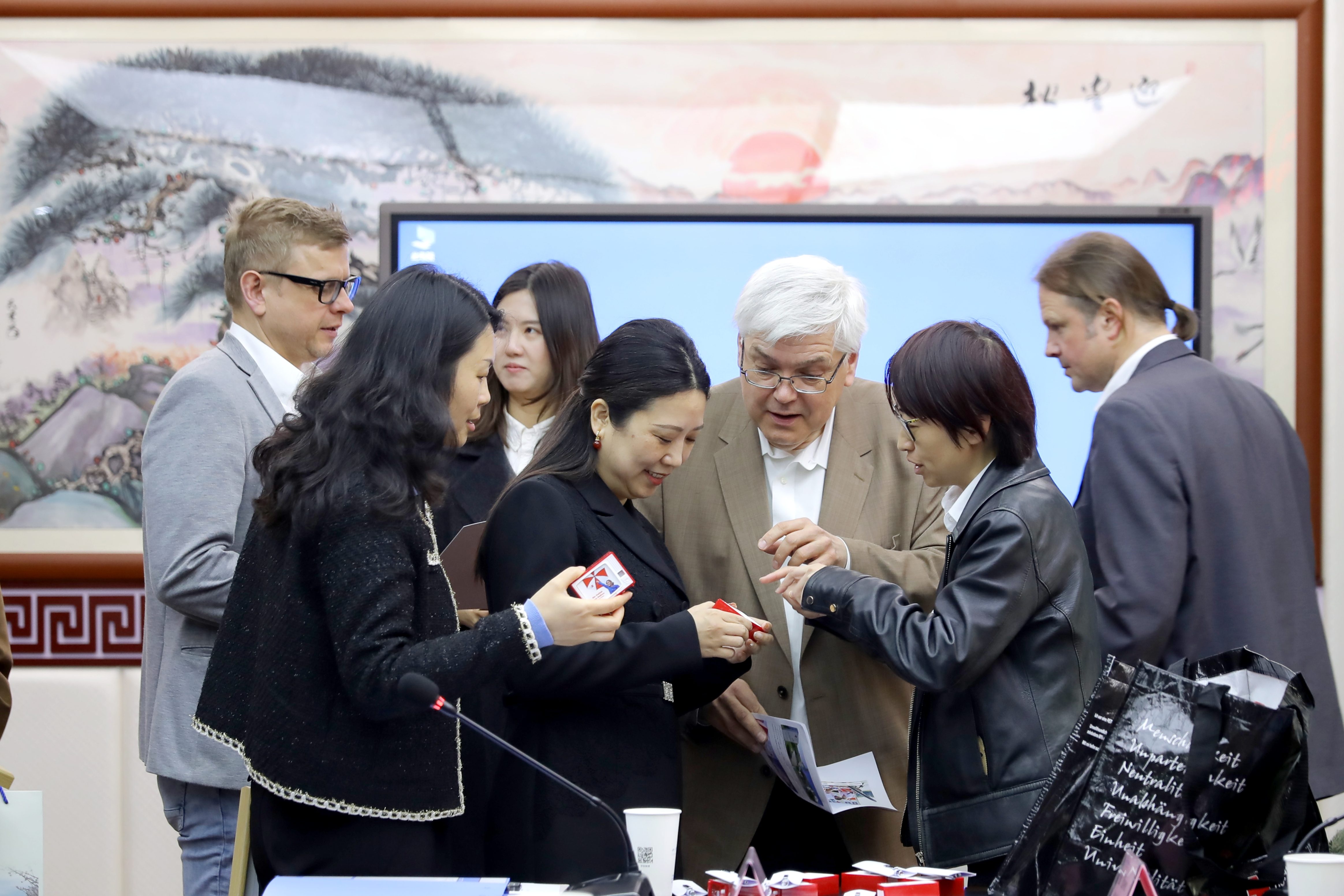 最后,合作交流座谈会在南园召开。尚宁川代表学校对代表团表示热烈欢迎,介绍了学校办学特色、专业建设及国际合作成果。会上还介绍了我校护理学科建设、专业发展与人才培养成效,养生康复学院办学定位、专业特色与康养人才培养情况等。双方围绕课程共建、学生联合培养、师资互访、养老院运营管理、实训基地共建等议题深入洽谈,达成多项合作共识。会上,双方互赠纪念品,以礼为媒、共叙友谊。我校向德国代表团赠送蕴含中华优秀传统文化与办学底蕴的纪念品,代表团回赠具有巴伐利亚地域特色与红十字精神的纪念品,象征中德双方教育合作情谊长存、携手共进。